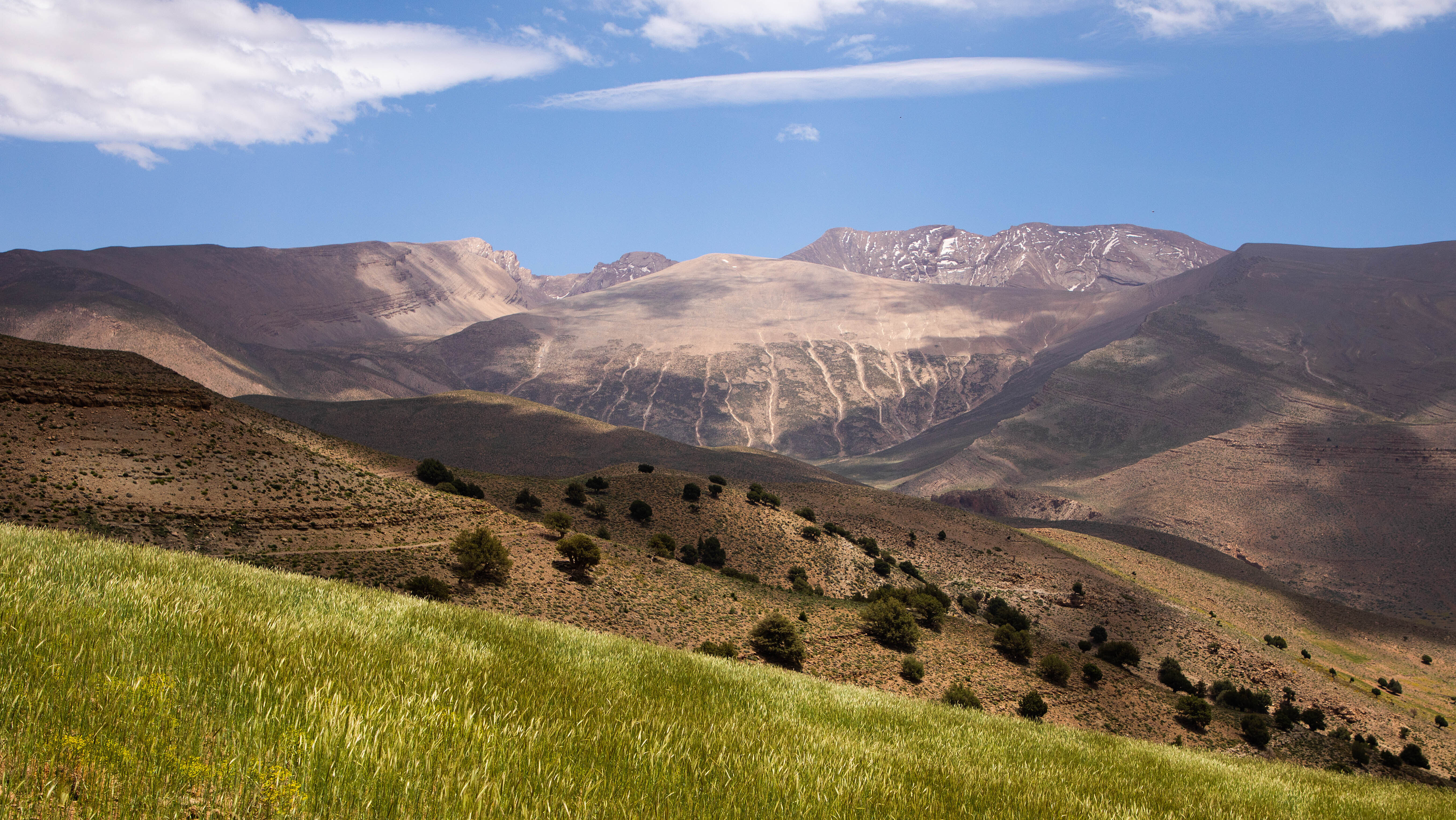 Nach der fakultativen Besteigung des MGouns steigen wir ab zu den fruchtbaren Feldern und Dörfern im Bougmez. Einem Balkon gleich bietet sich eine unvergleichliche Aussicht auf das Heimattal unseres Begleitteams, wo wir noch einmal die Gastfreundschaft der Berber geniessen.